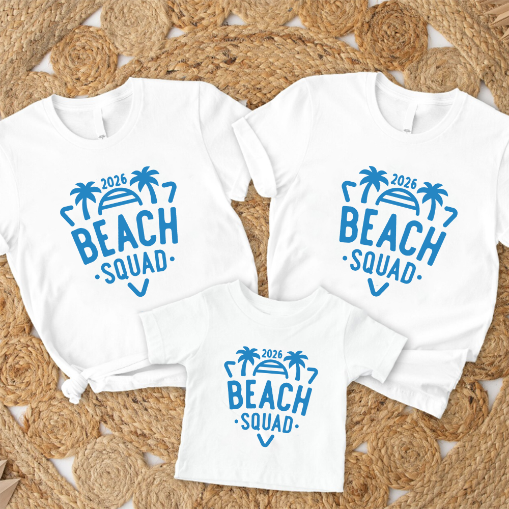 The ultimate family holiday tops are here! Featuring '2026 Beach Squad' slogans, these tops are perfect for travel day and available in all kid and adult size options.