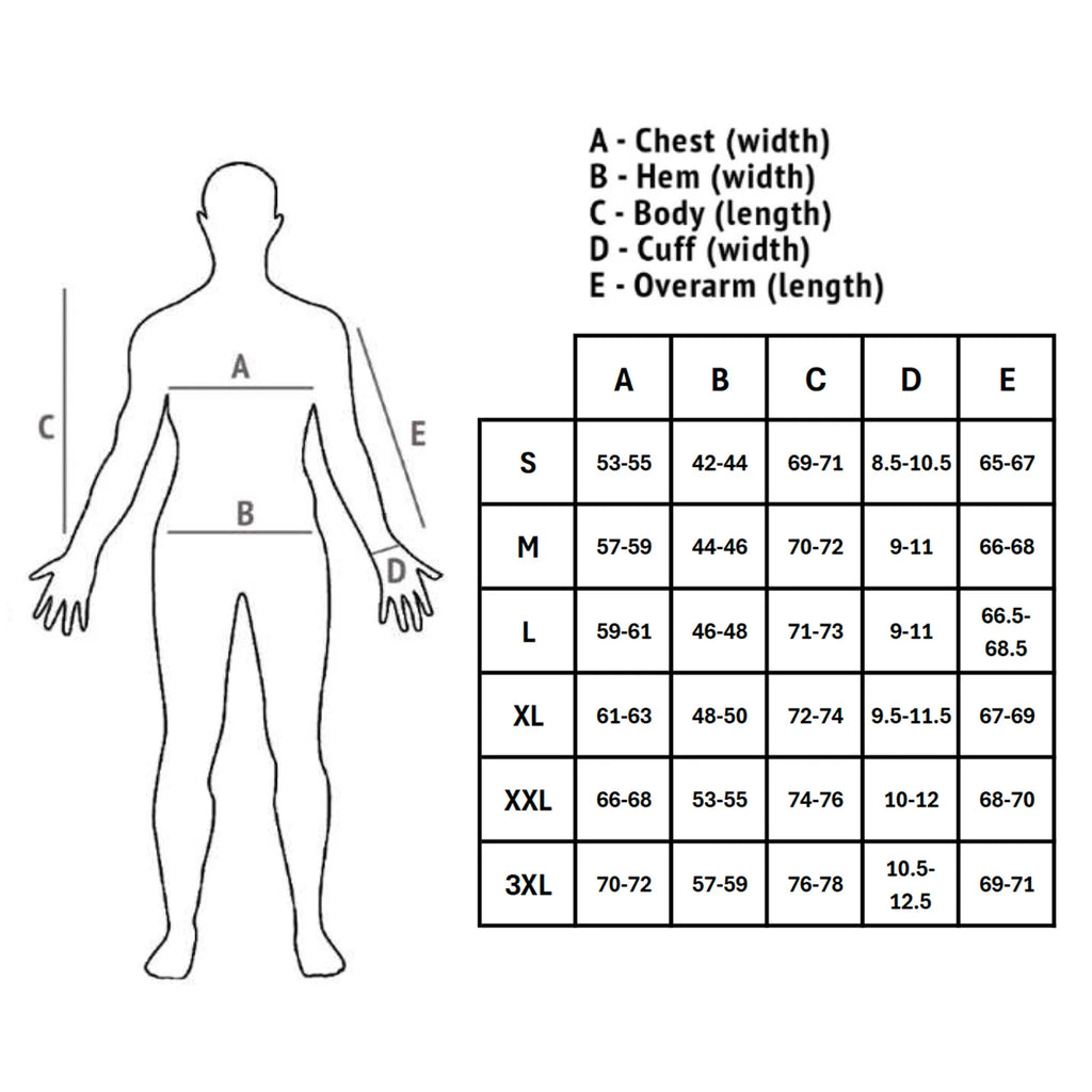 - Garment Size (Chest): Small 44"; Medium 46"; Large 48"; XL 50"; XXL 53"; 3XL 56"