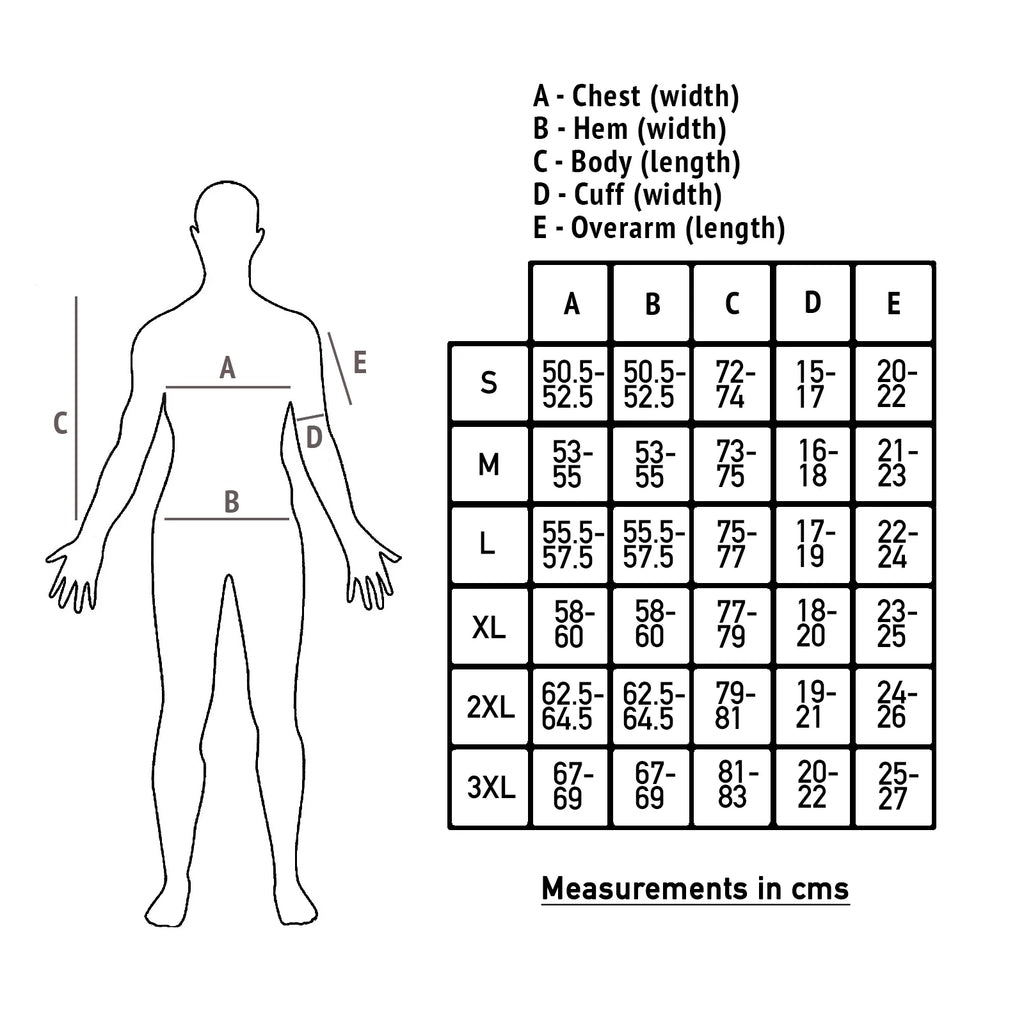 • Garment Size (Chest): Small 40"; Medium 42"; Large 44"; XL 46"; XXL 50"; 3XL 54"