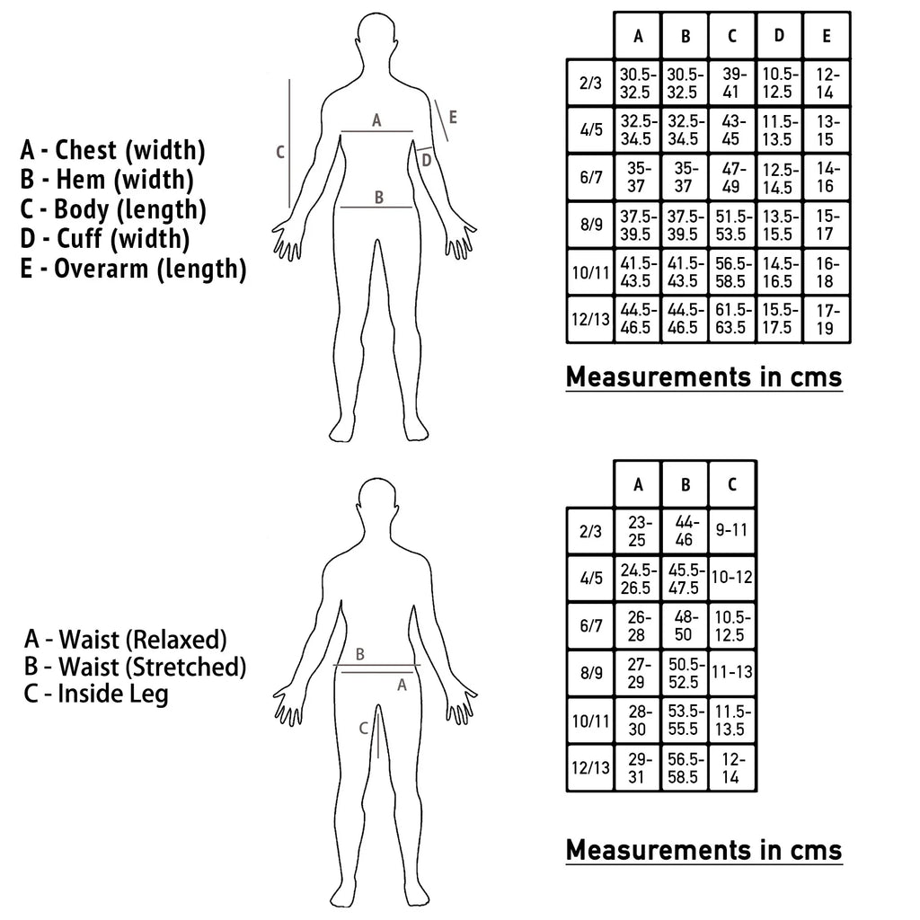 - Height: 2-3 yrs 98cm; 4-5 yrs 110cm; 6-7 yrs 122cm; 8-9 yrs 134cm; 10-11 yrs 146cm; 12-13 yrs 158cm