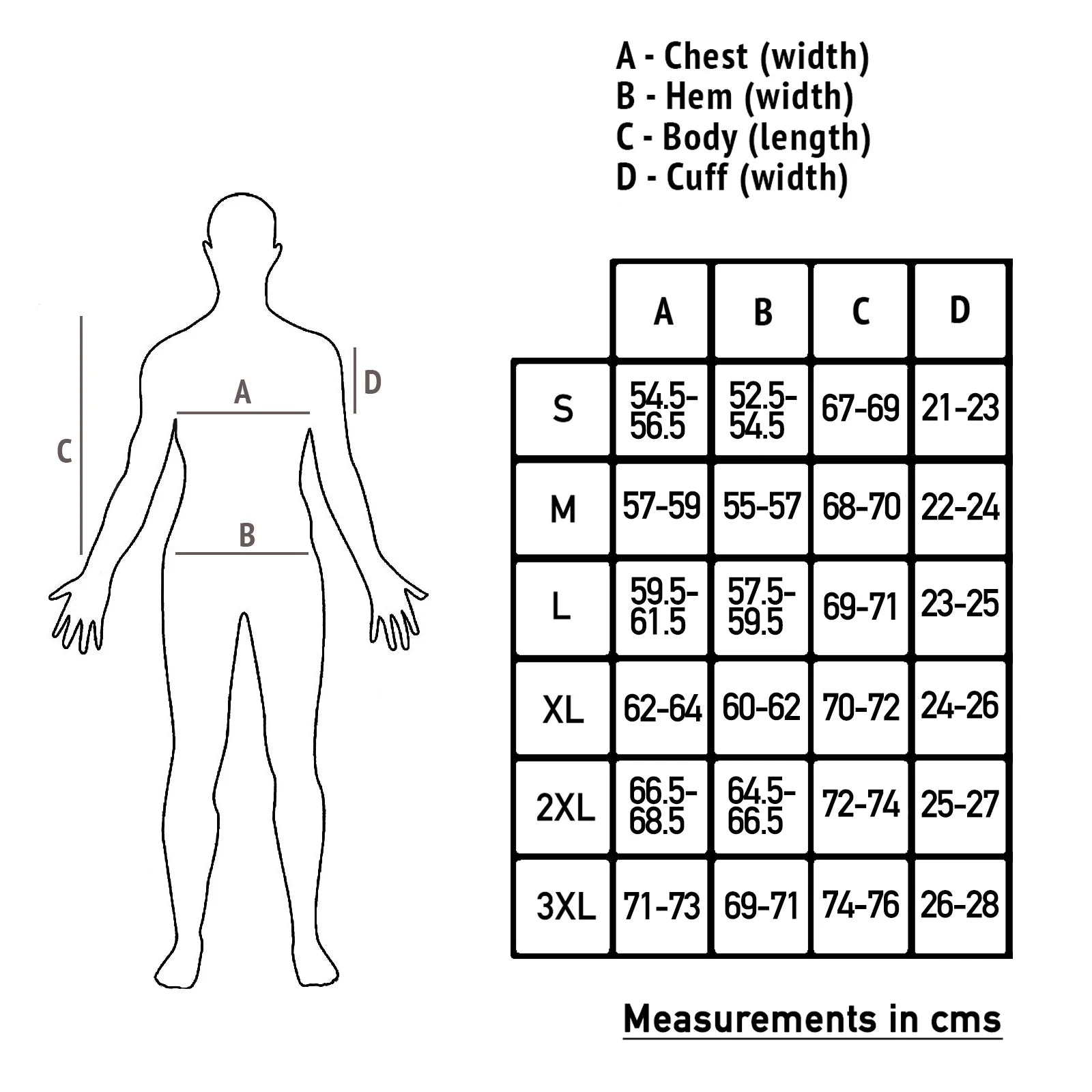- Garment Size (Chest): Sm 44"; Med 46"; Lge 48"; XL 50"; XXL 53"; 3XL 57"