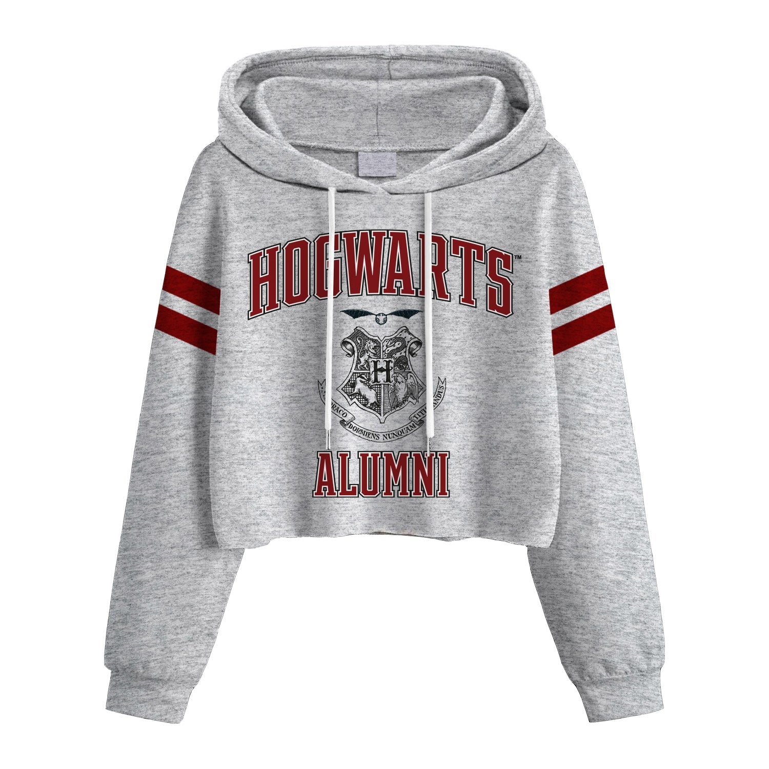 Officially Licensed Harry Potter merchandise. This cropped pullover hooded sweatshirt features an iconic design form the world of Hogwarts, printed on a 65% cotton / 35% polyester heather grey sweatshirt. 30 degrees wash