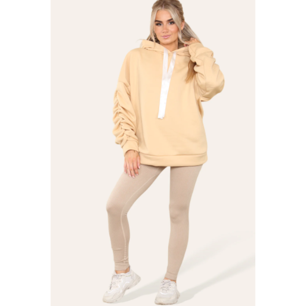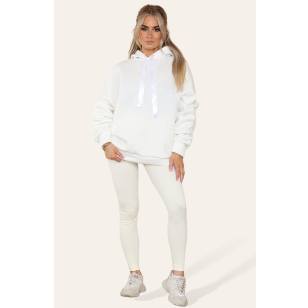 Say hi to your new Winter fave comfy set. Featuring oversized ruched hoodie, matched with a flexible fitting legging, this set is a stylish and comfortable solution for your layering needs. Crafted with a blend of cotton and polyester, this hoody is lightweight and soft. The oversized design and drawstring cuffs make it a perfect fit for any size, and the ruched hood gives it a unique aesthetic.