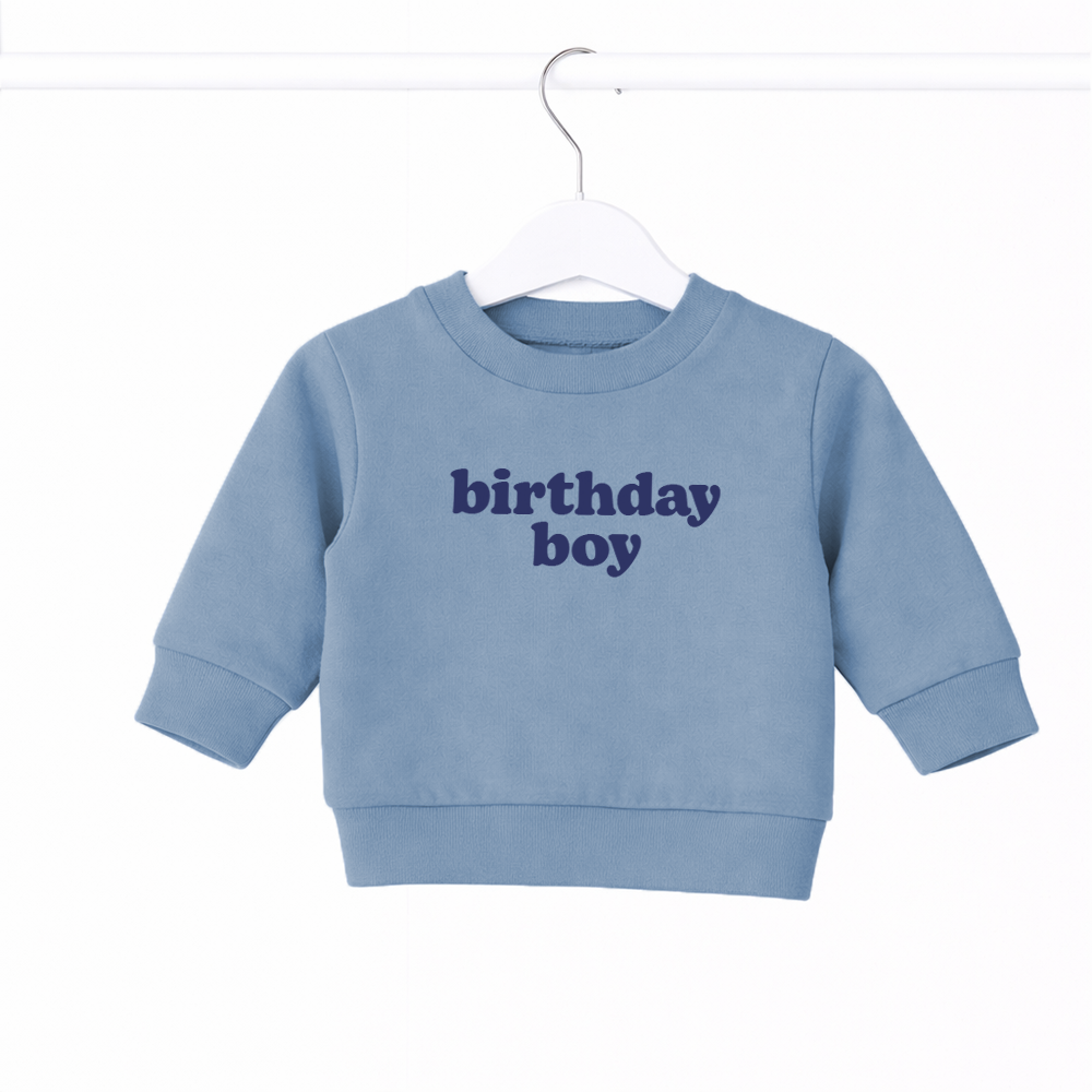 For the Birthday Boy. This cute & simple sweatshirt is the perfect layer for all the birthday celebrations. A great sweatshirt for all those little one, available from 6-12 Months - 5-6 Years.  It's a fashion favourite with super-soft brushed back fleece on the inside for a cosy feeling.