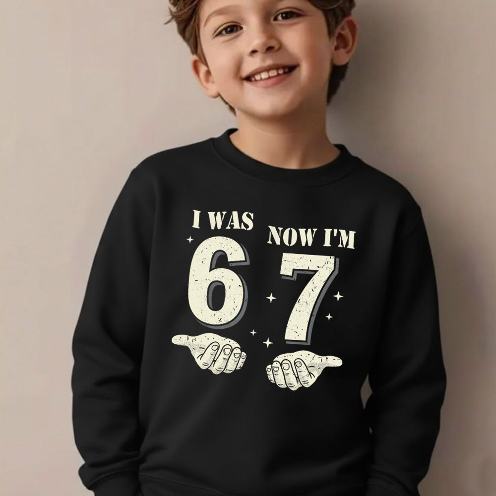 Celebrate turning seven in style with this trendy birthday sweatshirt inspired by cool "67" slang. Featuring a fun hands graphic design, it's the ultimate party fit for kids who want to look effortlessly cool on their special day. Soft, comfortable, and packed with personality, this sweatshirt makes the perfect birthday outfit or gift for the birthday kid who's got serious style credentials.