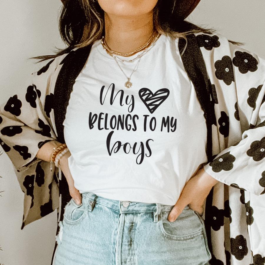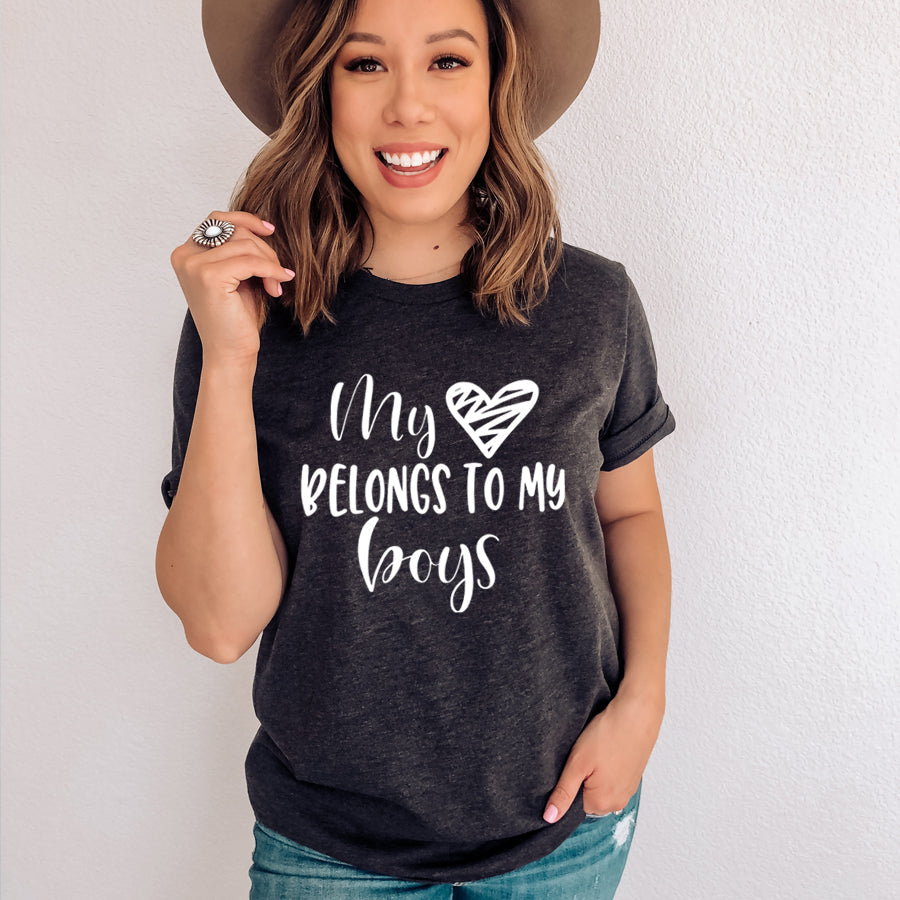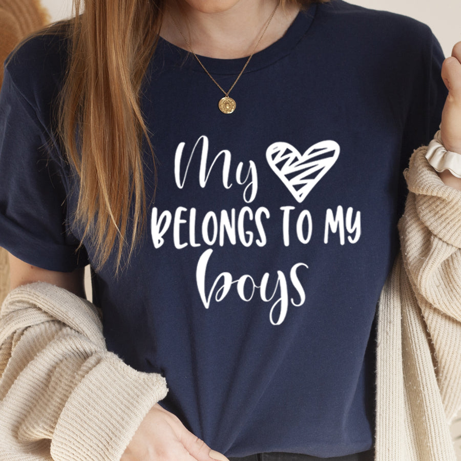 Any Mama of boys is sure to love this casual tee. Featuring a 'Heart Belongs To My Boys' slogan on front of a ringspun cotton tee, team this top with a pair of jeans and a cardigan for a perfect Autumn Mama look.