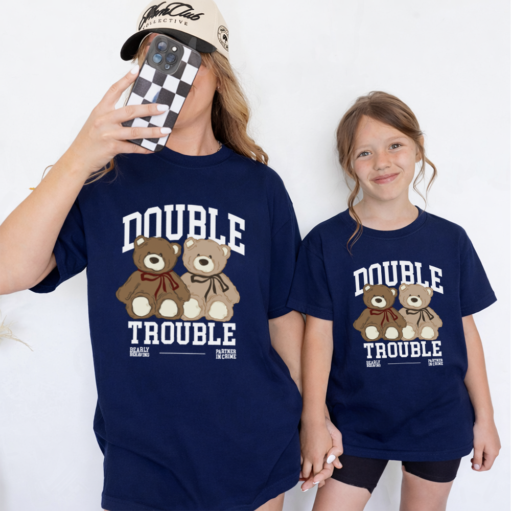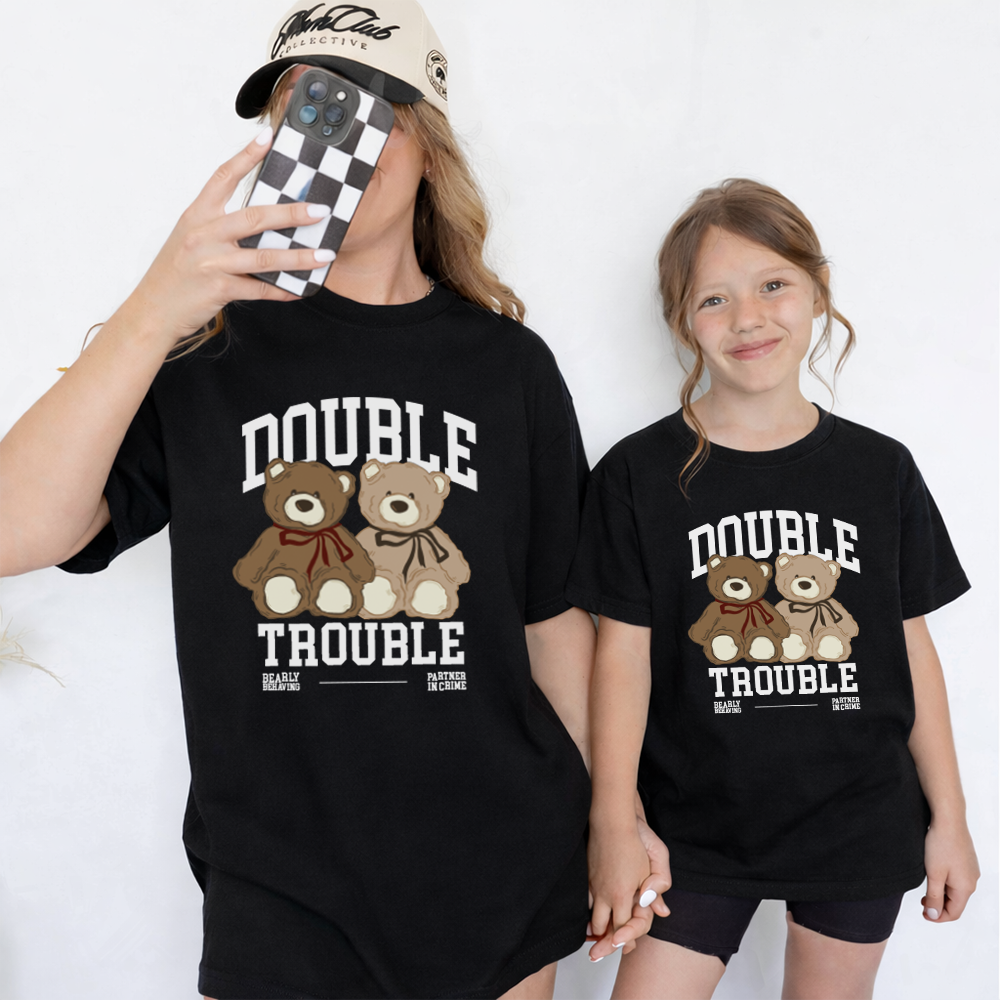 For the perfect duo. What's better than one ... two! The ultimate besties matching t-shirt. Featuring graphic slogan 'Double Trouble' with our adorable bear graphics. This coquette style t-shirt is a must have for your a your mini.