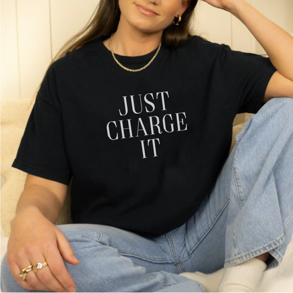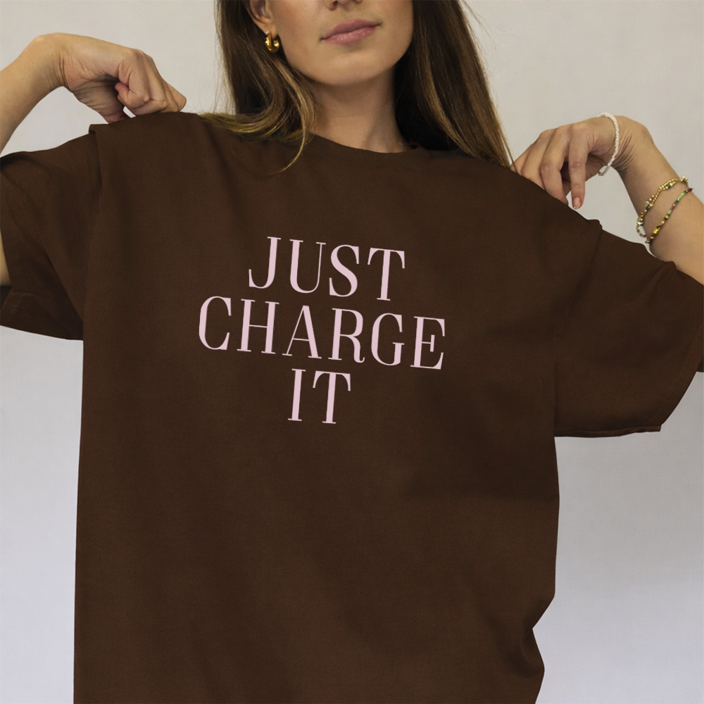 A friendly reminder for outside the Villa that you have to back yourself! The perfect oversized tee as a reminder that you have to 'Just Charge It'. A great tee for running around or just relaxing. Just pair with jeans or joggers for the ultimate casual look.