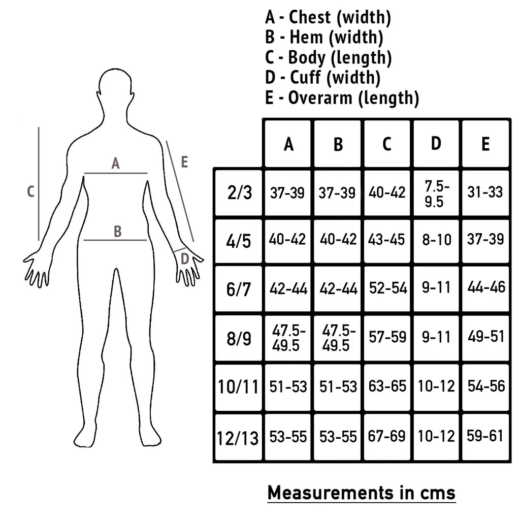 - Garment Size (Chest): 2/3yrs (28"), 4/5yrs (30"), 6/7yrs (32"), 8/9yrs (36"), 10/11yrs (38"), 12/13