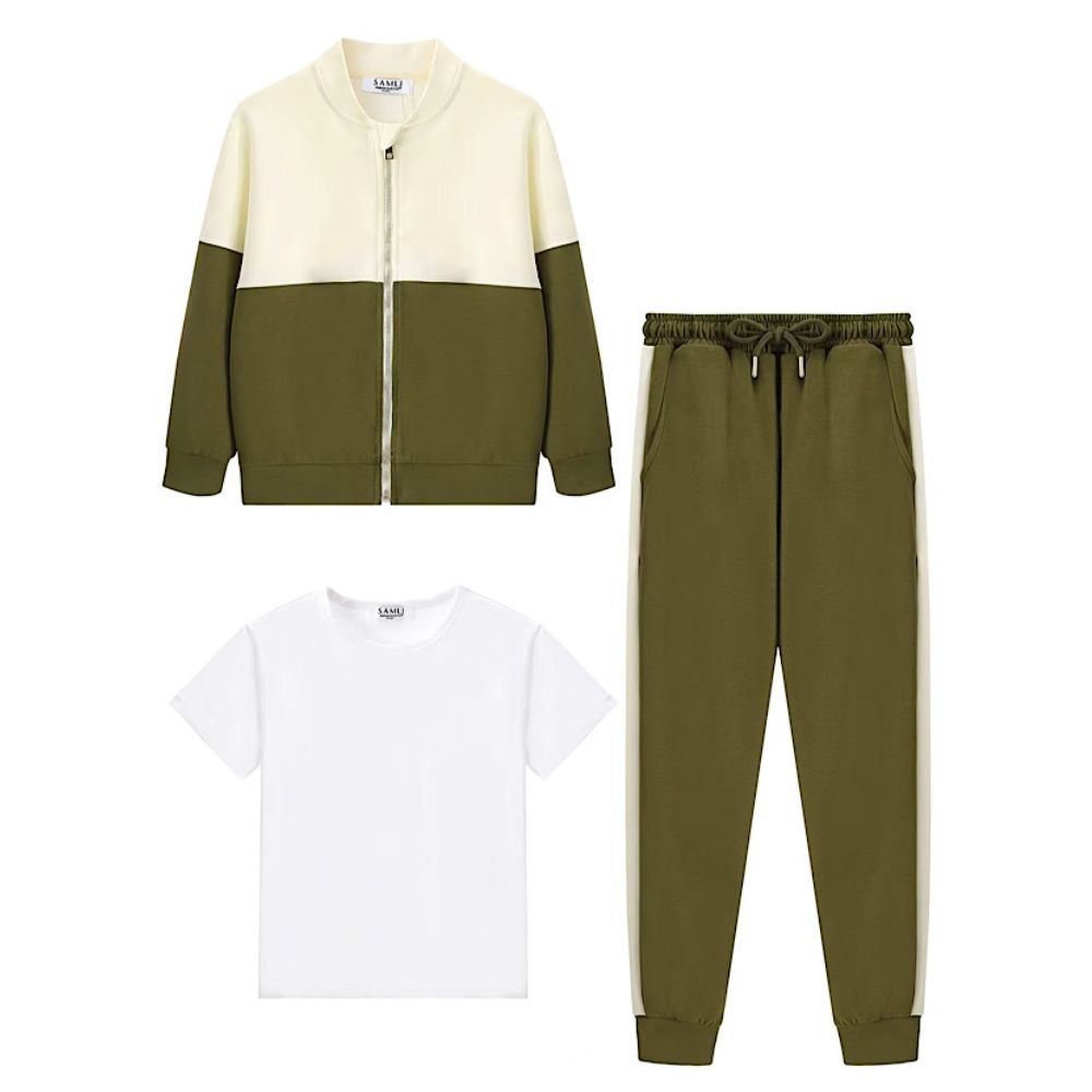 This three-piece tracksuit set combines contemporary style with practical comfort for young wearers. The two-tone zip-up jacket features a cream and khaki colour block design with a sleek collarless cut, paired with a crisp white short-sleeve t-shirt and coordinating trousers.