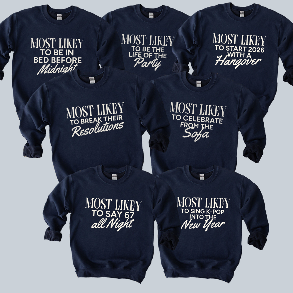 Most Likely to match this New Years Eve? I think so. These matching sweatshirts are the perfect New Years Eve/ New Years outfits for each one of the family. Made for laughing & making memories. Just pick your ideal combination.
