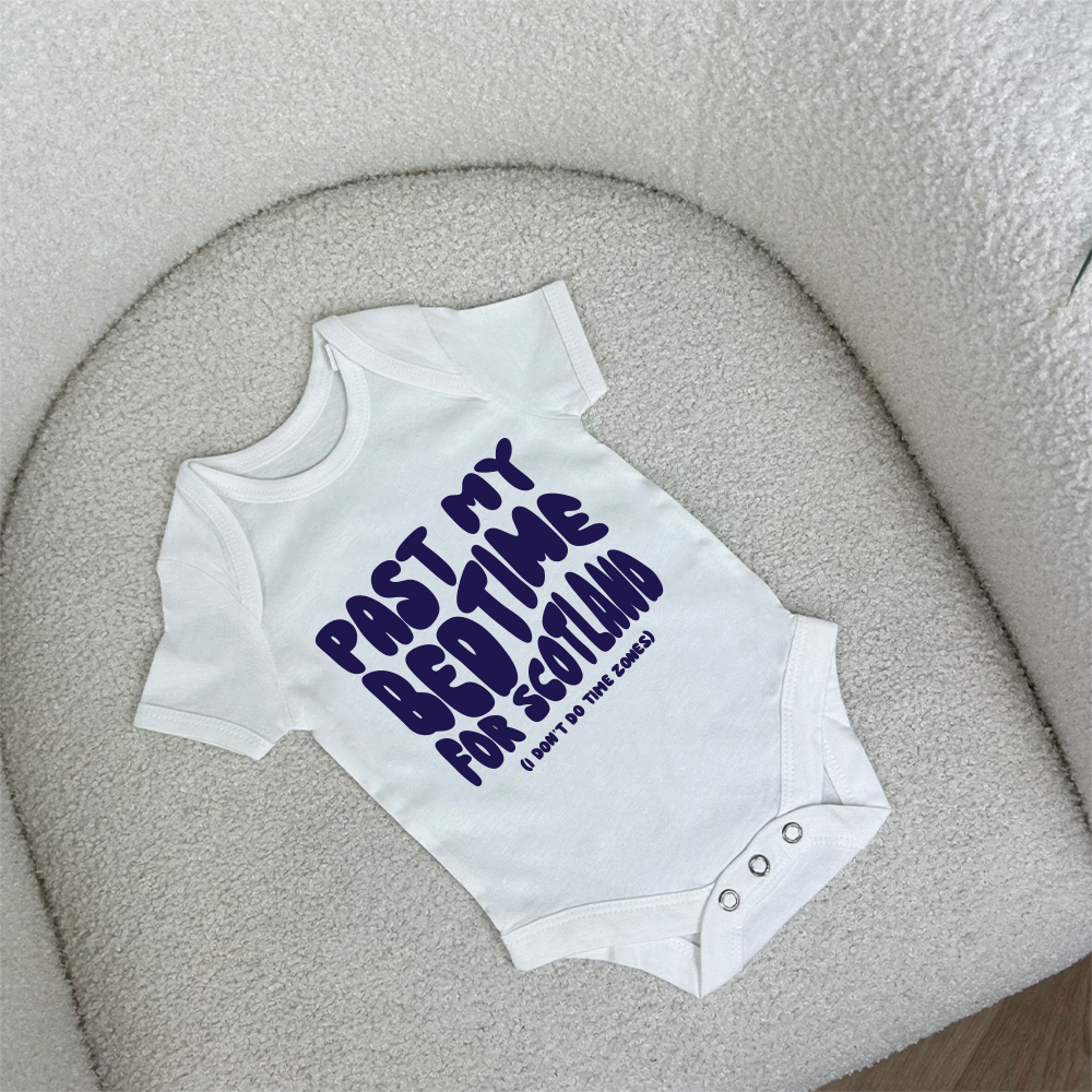 Perfect for cheering Scotland on to glory even while feeling sleepy. The cutest Scotland Supporter baby Vest. Featuring Graphic Slogan 'Past my Bedtime for Scotland' made for a Wee Bairn Backing Scotland!