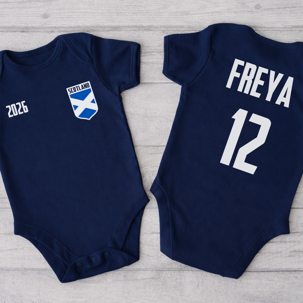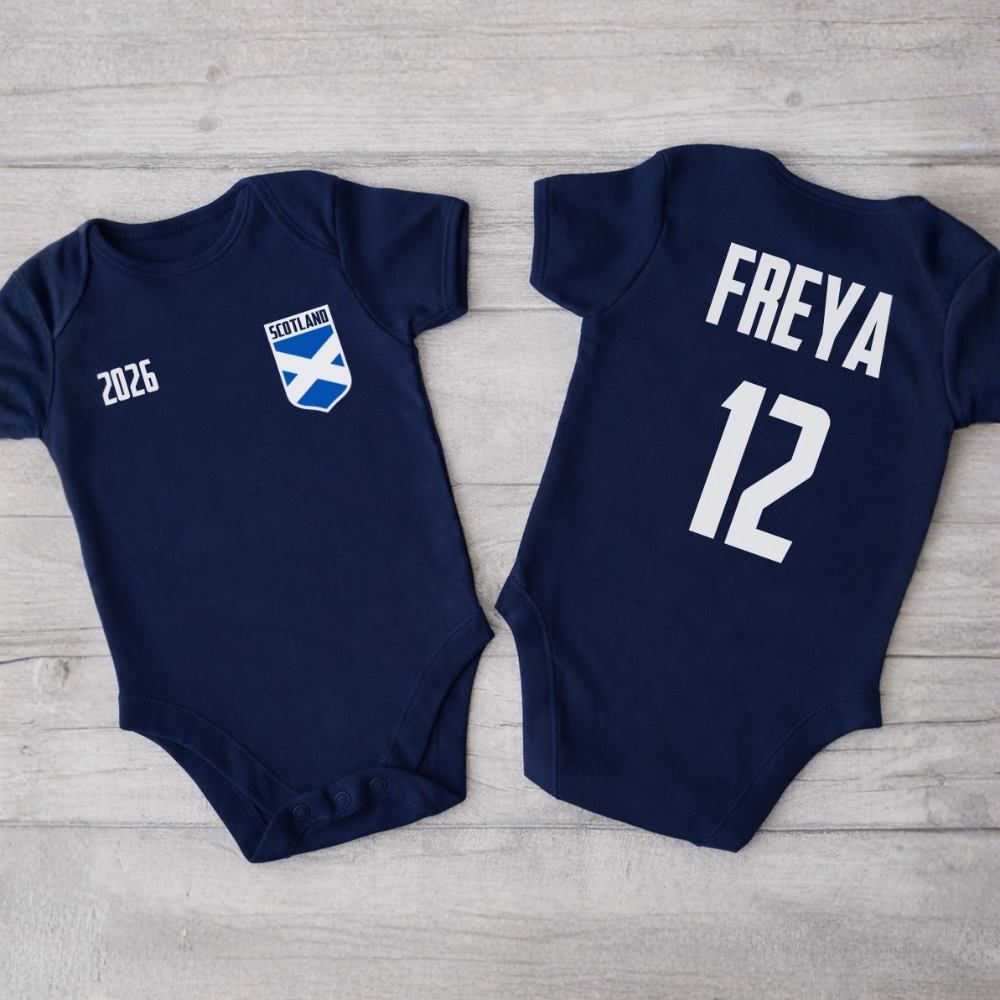 Perfect for cheering Scotland on to glory even for a little one. The cutest Scotland Supporter baby Vest. Featuring Graphic front & back of the Scottish flag with an added personal touch on the back. Made for a Wee Bairn Backing Scotland!