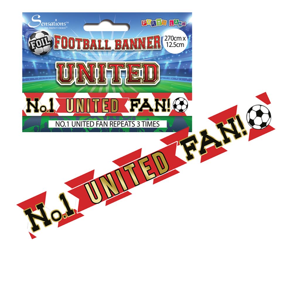 Red And White No1 United Fan Foil Party Banner. This Football Banner Is The Perfect Finshing Touch For Your Manchester United FC Themed Party.