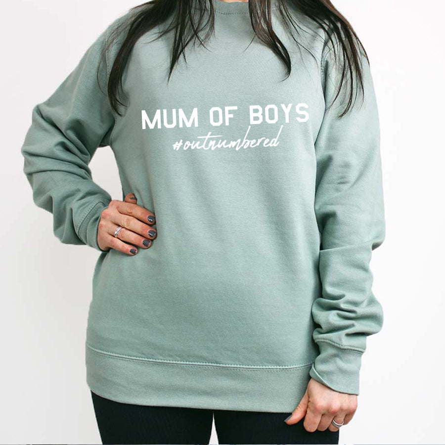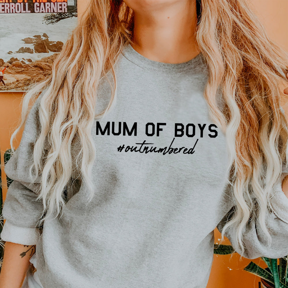Complete your Mum wardrobe with this casual & cute sweatshirt. Featuring 'Mum Of Boys- Outnumbered' slogan, this top is perfect for the school run.