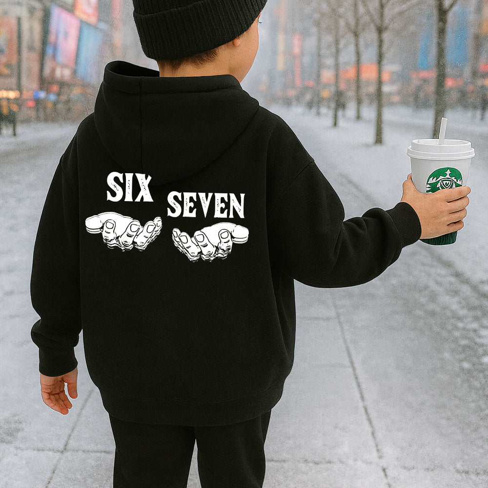 The perfect all year round hoodie for the kids that can't stop saying 67 .... A graphic hoodie guaranteed to get some laughs. Featuring front & back logos, with graphic slogan 'Six Seven Vibes'. Must have in any little ones wardrobe.